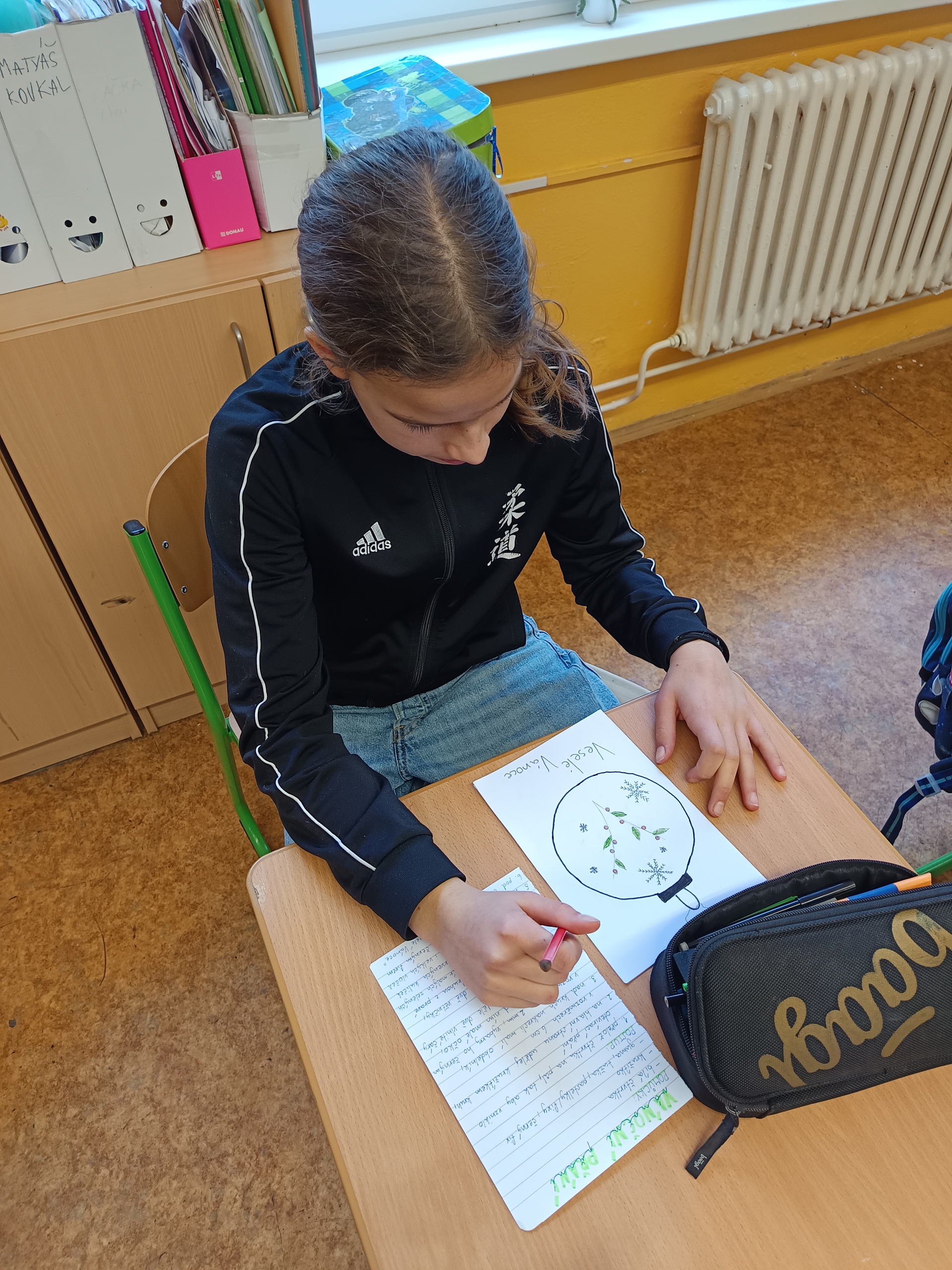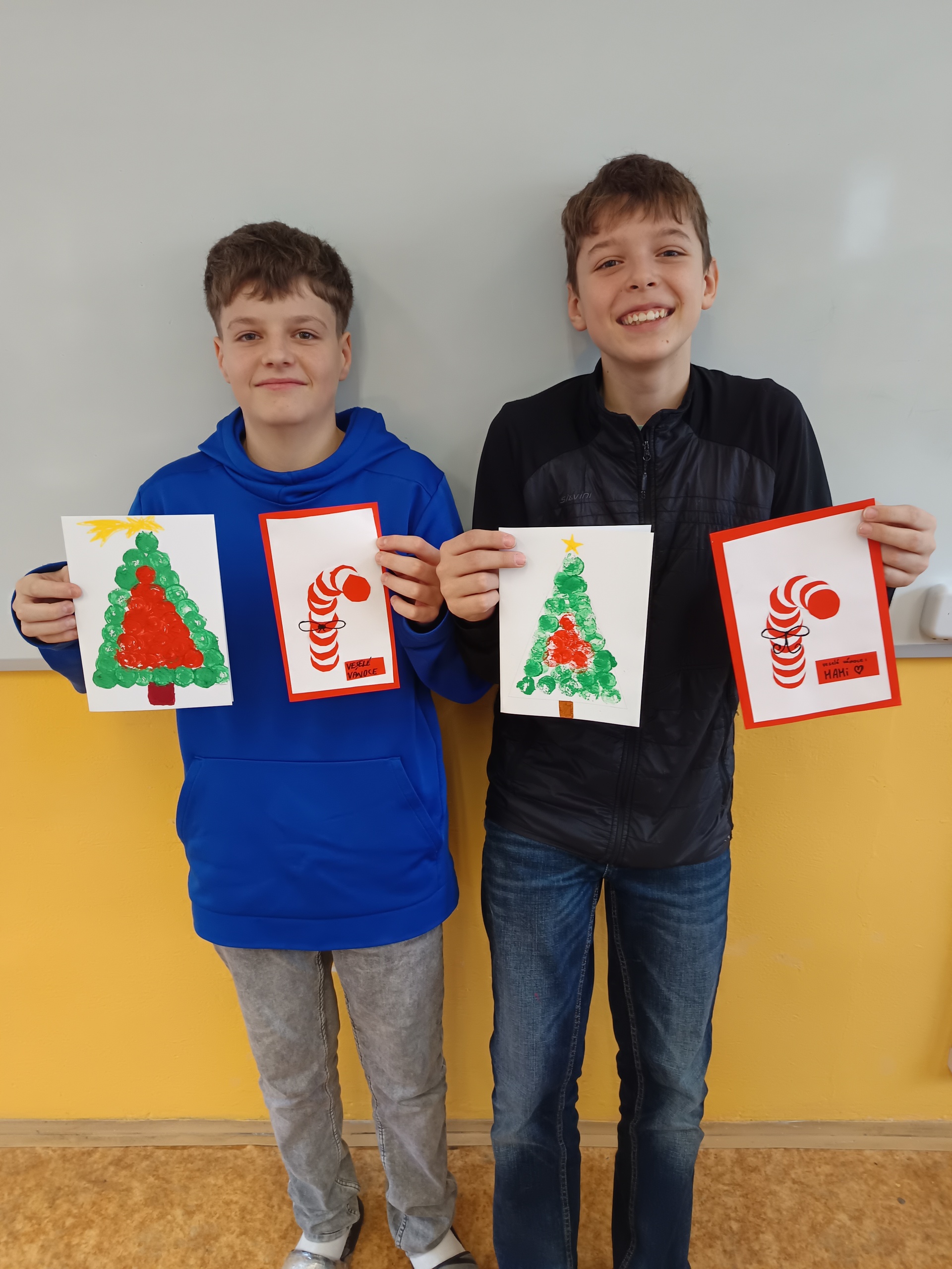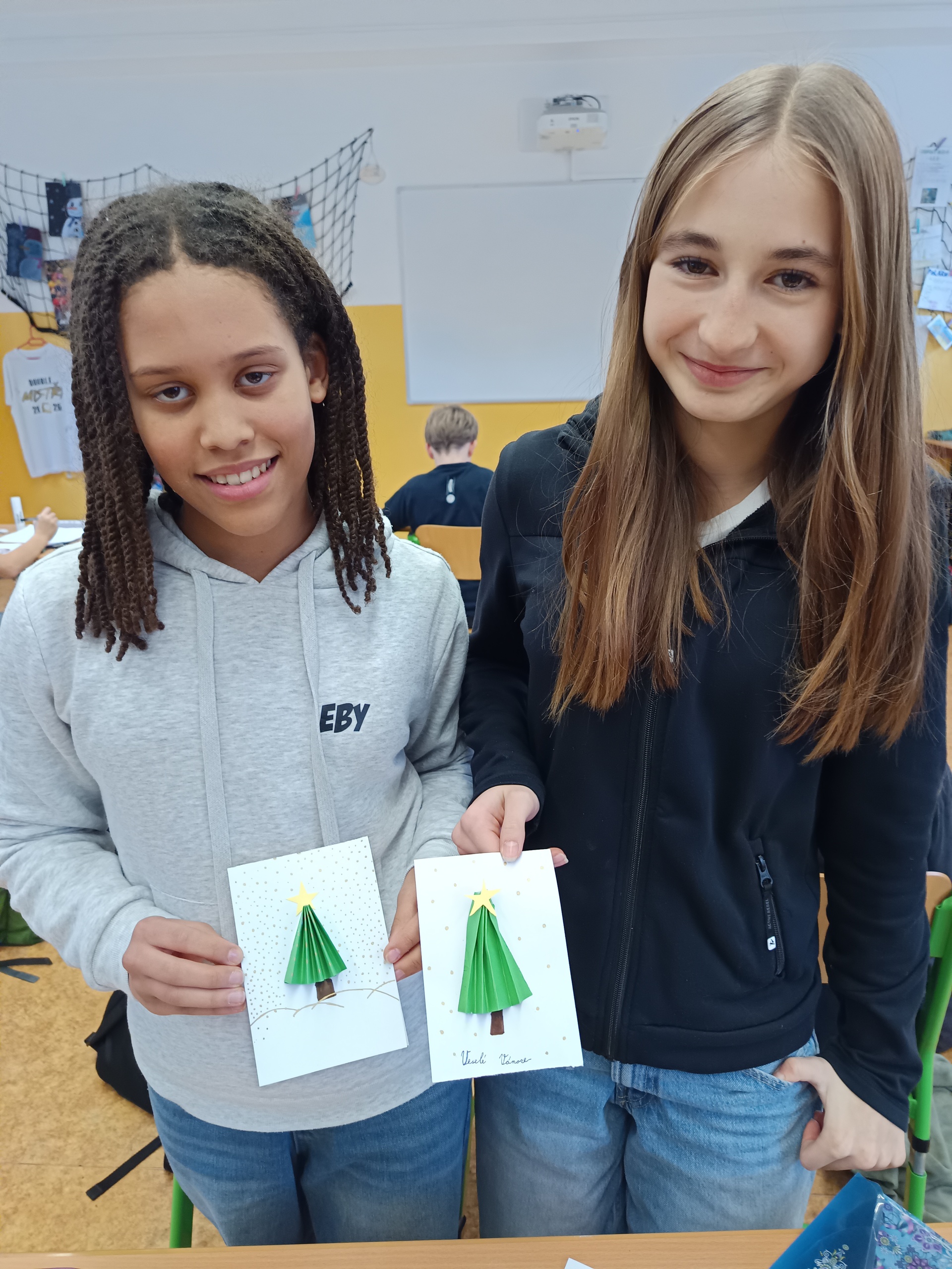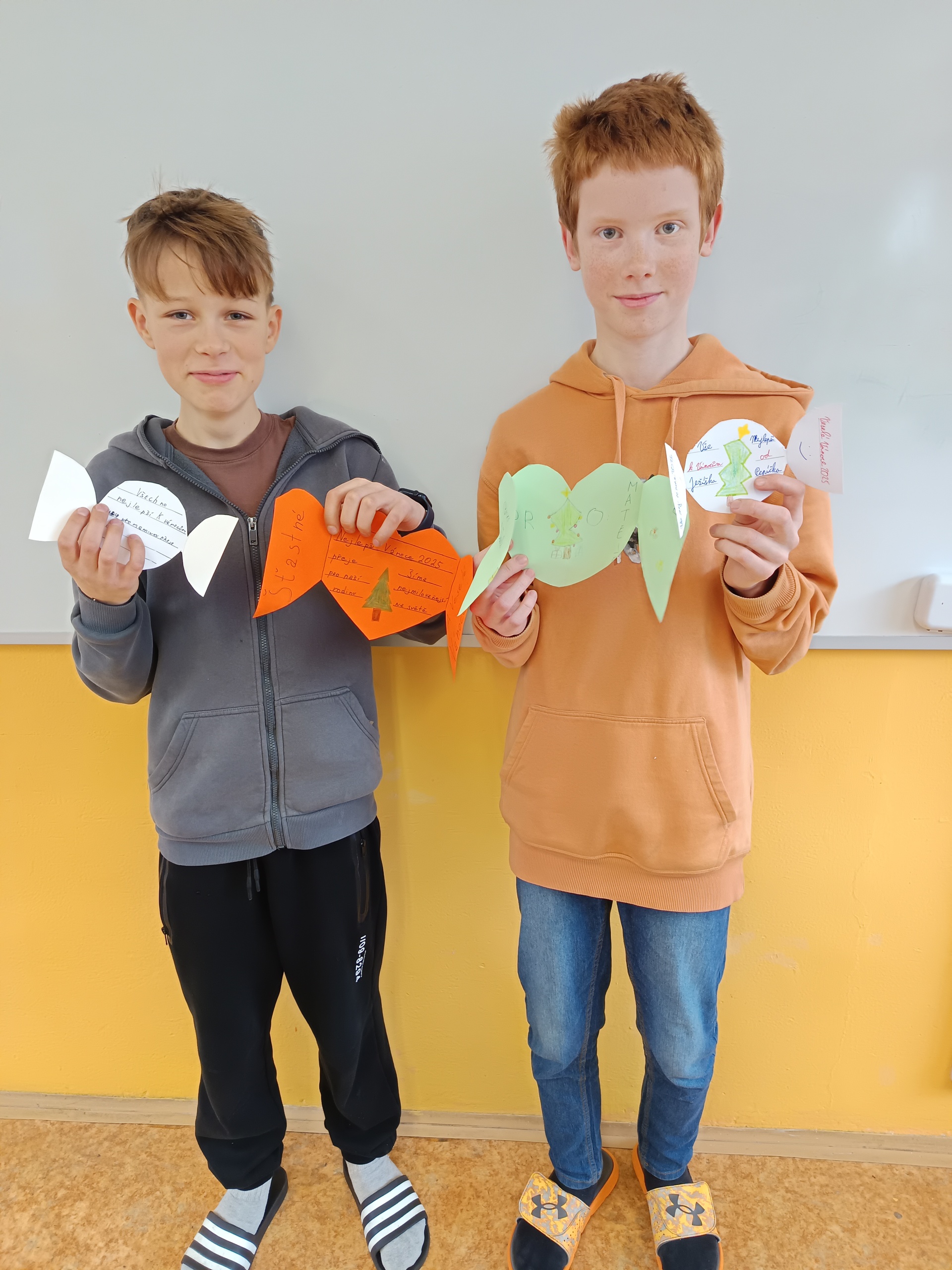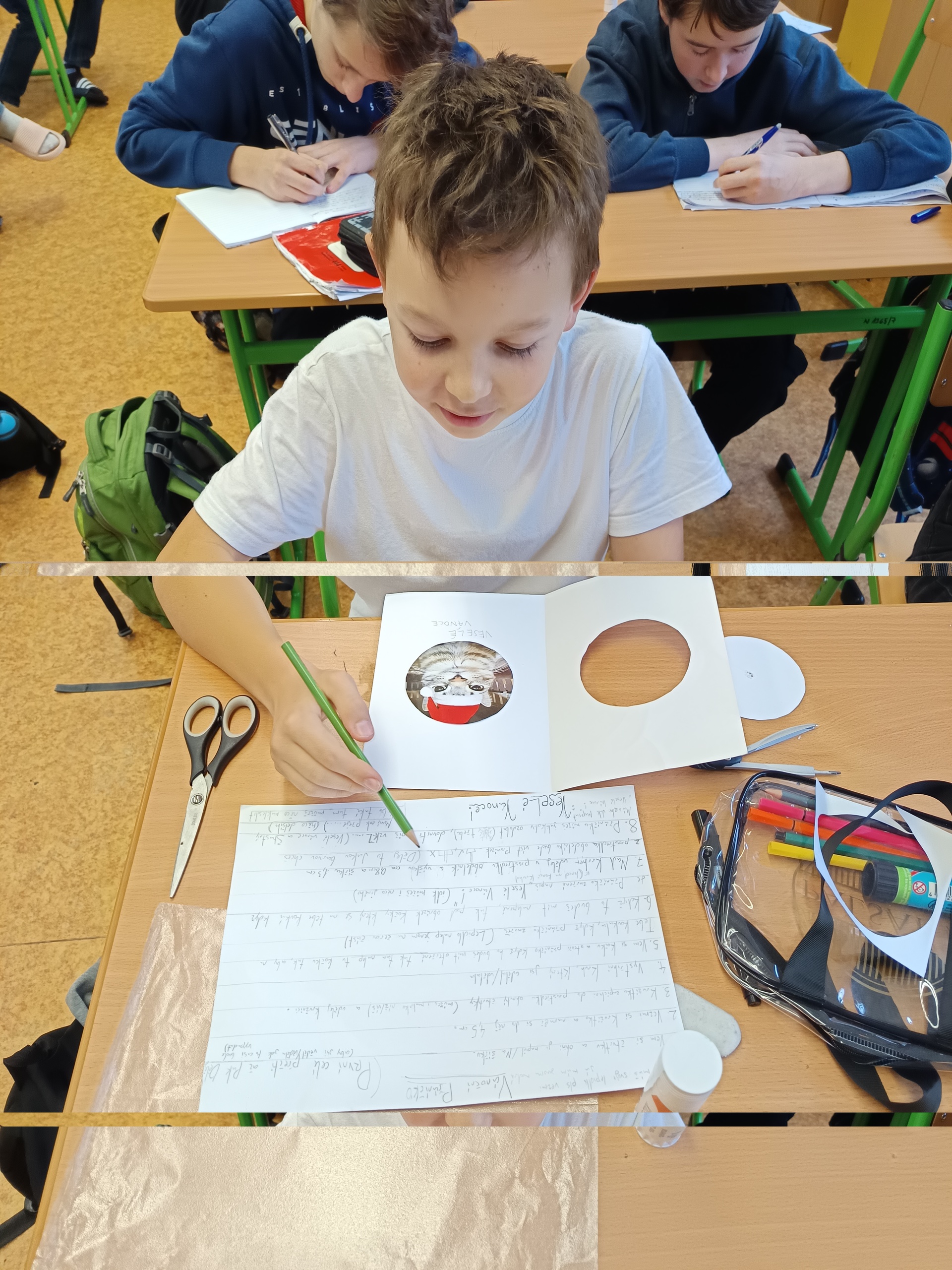 Na poslední hodinu slohu v roce 2025 každý žák svoji slohovou práci přinesl a k ní i všechny potřebné pomůcky a materiál. Třída byla rozlosována do dvojic, ve kterých pak žáci vyráběli přání dle písemných pokynů svého spolužáka. Na závěr hodiny si ve dvojicích sedmáci své výtvory ukázali, porovnali je s přáním vyrobeným doma a navzájem si dali zpětnou vazbu. Co v práci chybělo? Který krok nebyl srozumitelně vysvětlený? Proč si přání nejsou podobná? Bavilo je dílo, které si pro ně kamarád připravil? Co by v práci udělali lépe? Jaké změny navrhují? Díky celé aktivitě si žáci mohli sami mezi sebou nejlépe zhodnotit kvalitu svých slohových prací. A navíc jsme strávili vyučovací čas ve vánoční atmosféře.