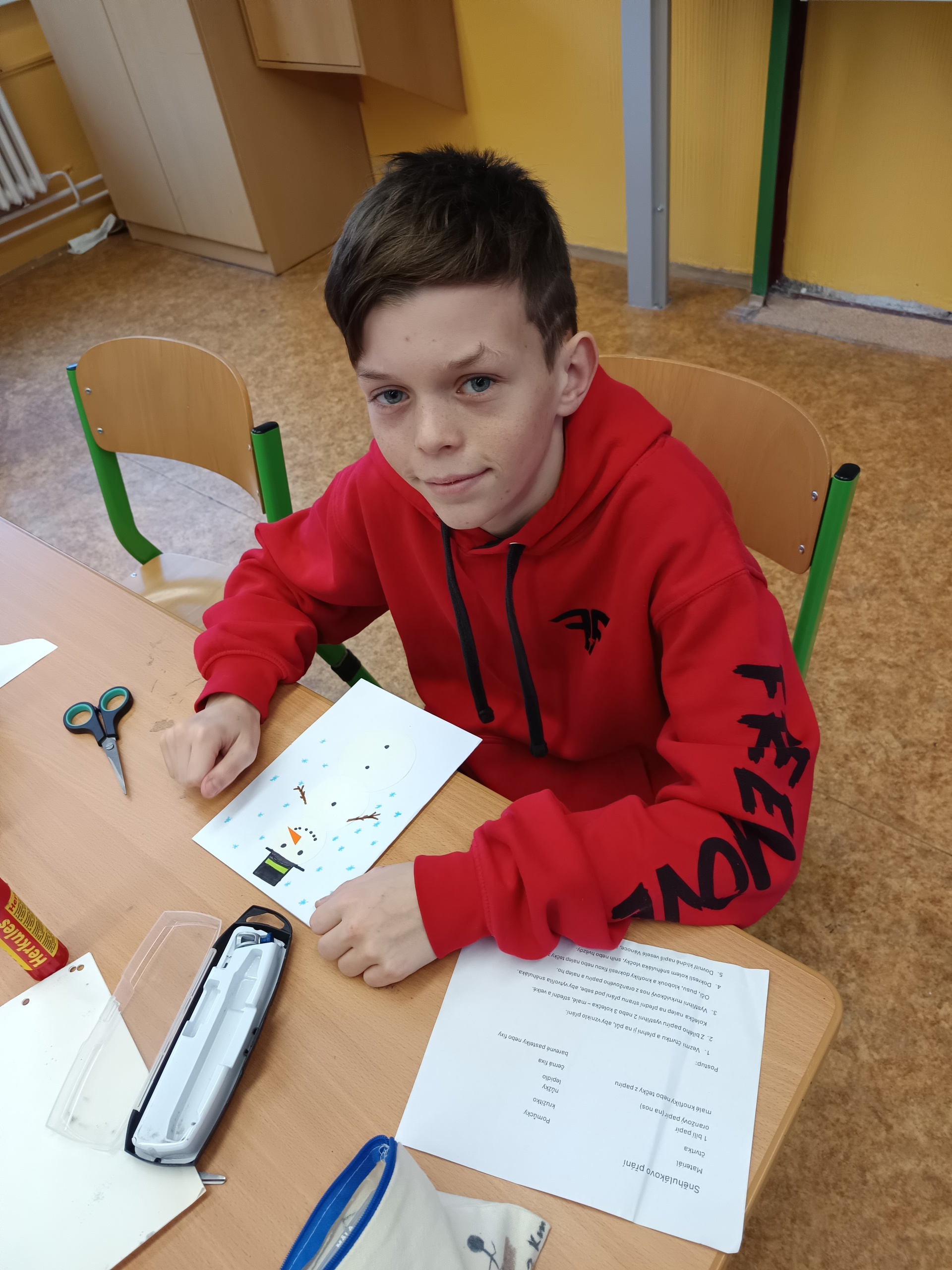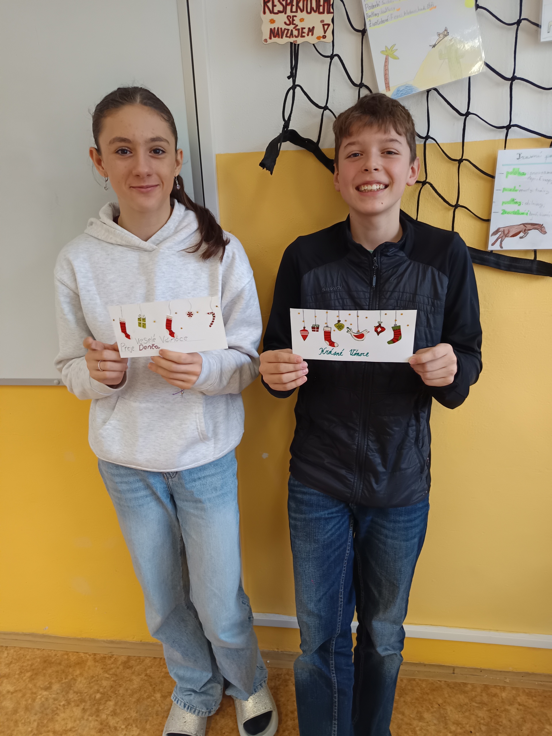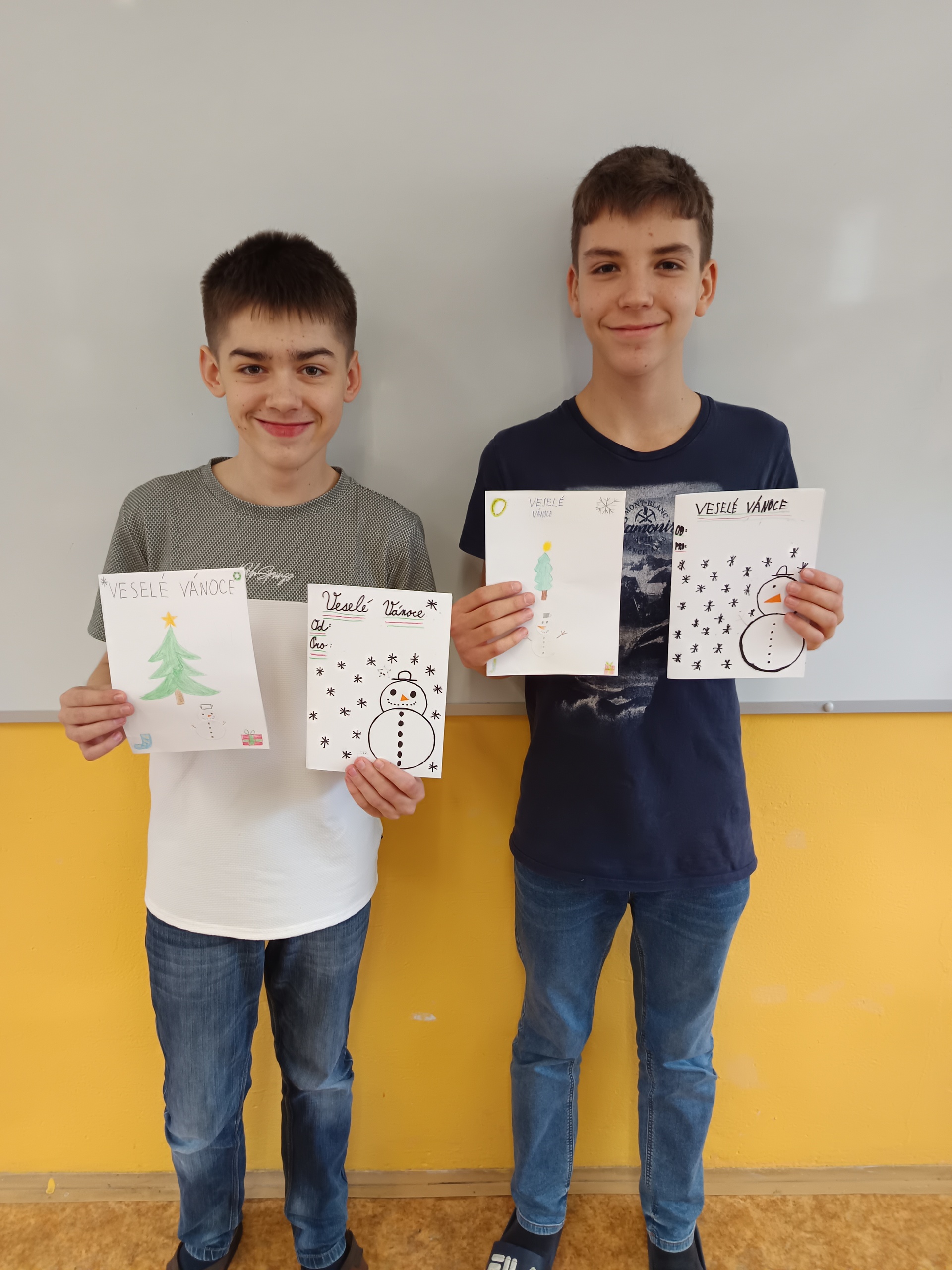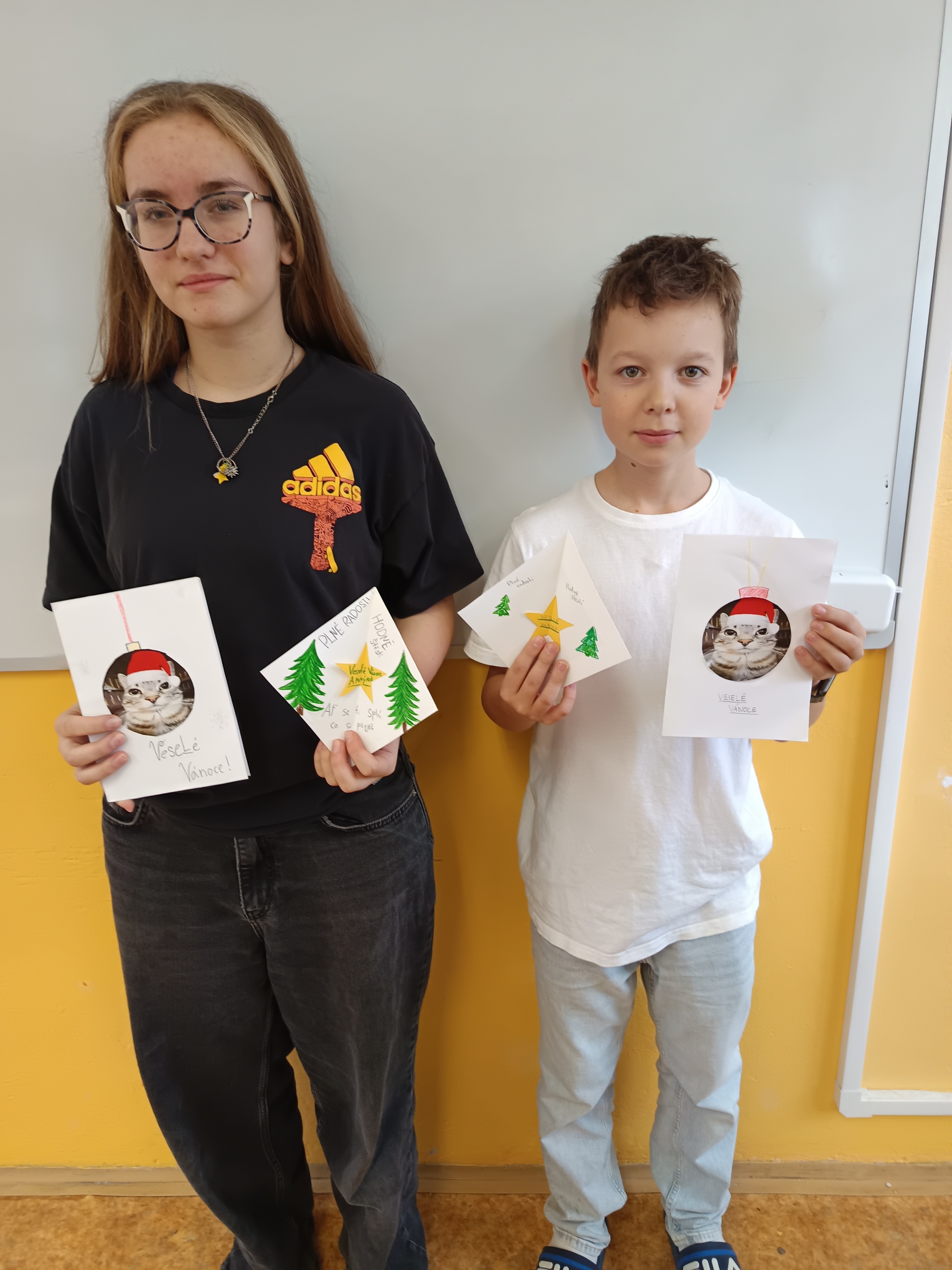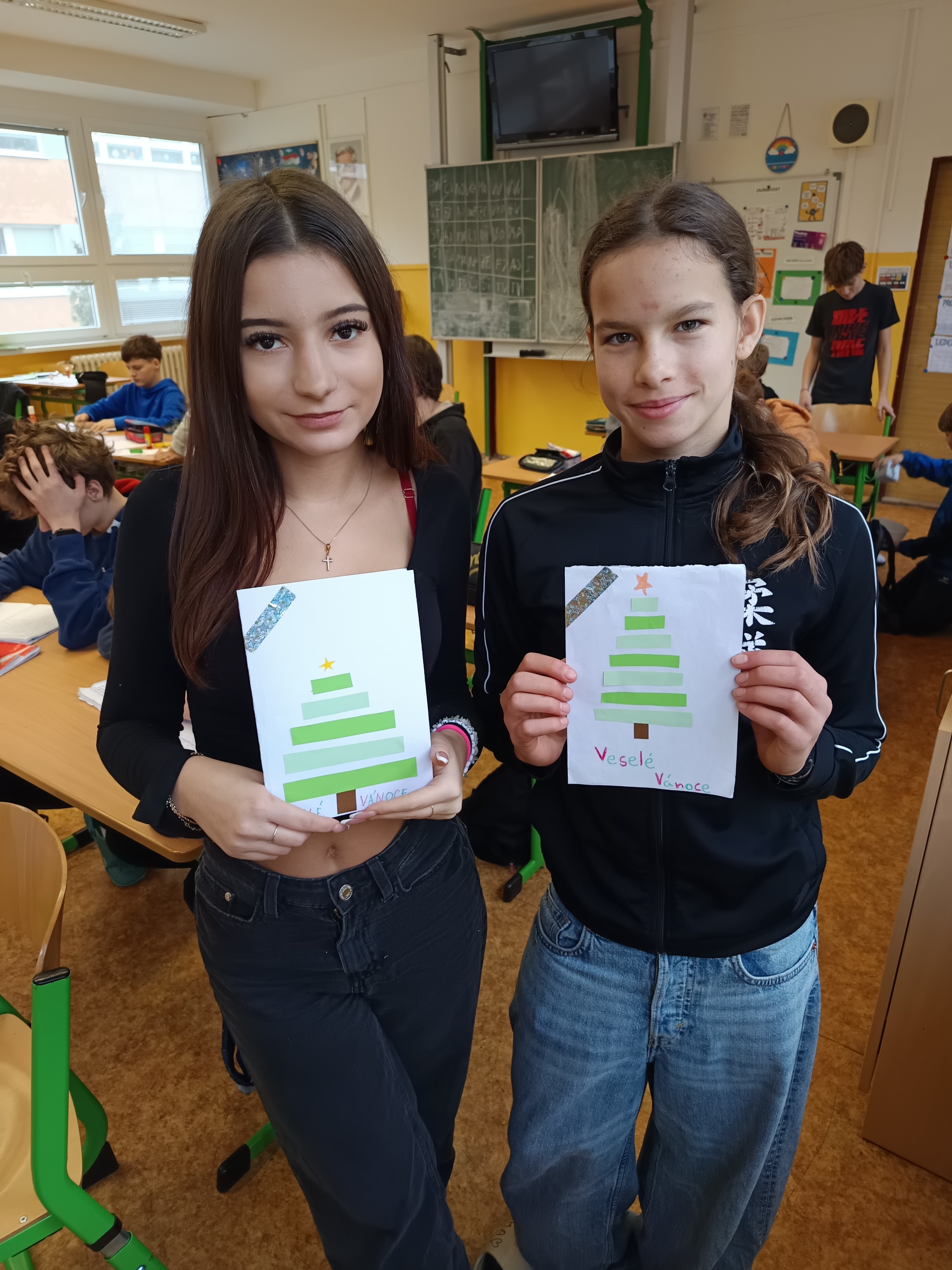 Na poslední hodinu slohu v roce 2025 každý žák svoji slohovou práci přinesl a k ní i všechny potřebné pomůcky a materiál. Třída byla rozlosována do dvojic, ve kterých pak žáci vyráběli přání dle písemných pokynů svého spolužáka. Na závěr hodiny si ve dvojicích sedmáci své výtvory ukázali, porovnali je s přáním vyrobeným doma a navzájem si dali zpětnou vazbu. Co v práci chybělo? Který krok nebyl srozumitelně vysvětlený? Proč si přání nejsou podobná? Bavilo je dílo, které si pro ně kamarád připravil? Co by v práci udělali lépe? Jaké změny navrhují? Díky celé aktivitě si žáci mohli sami mezi sebou nejlépe zhodnotit kvalitu svých slohových prací. A navíc jsme strávili vyučovací čas ve vánoční atmosféře.
