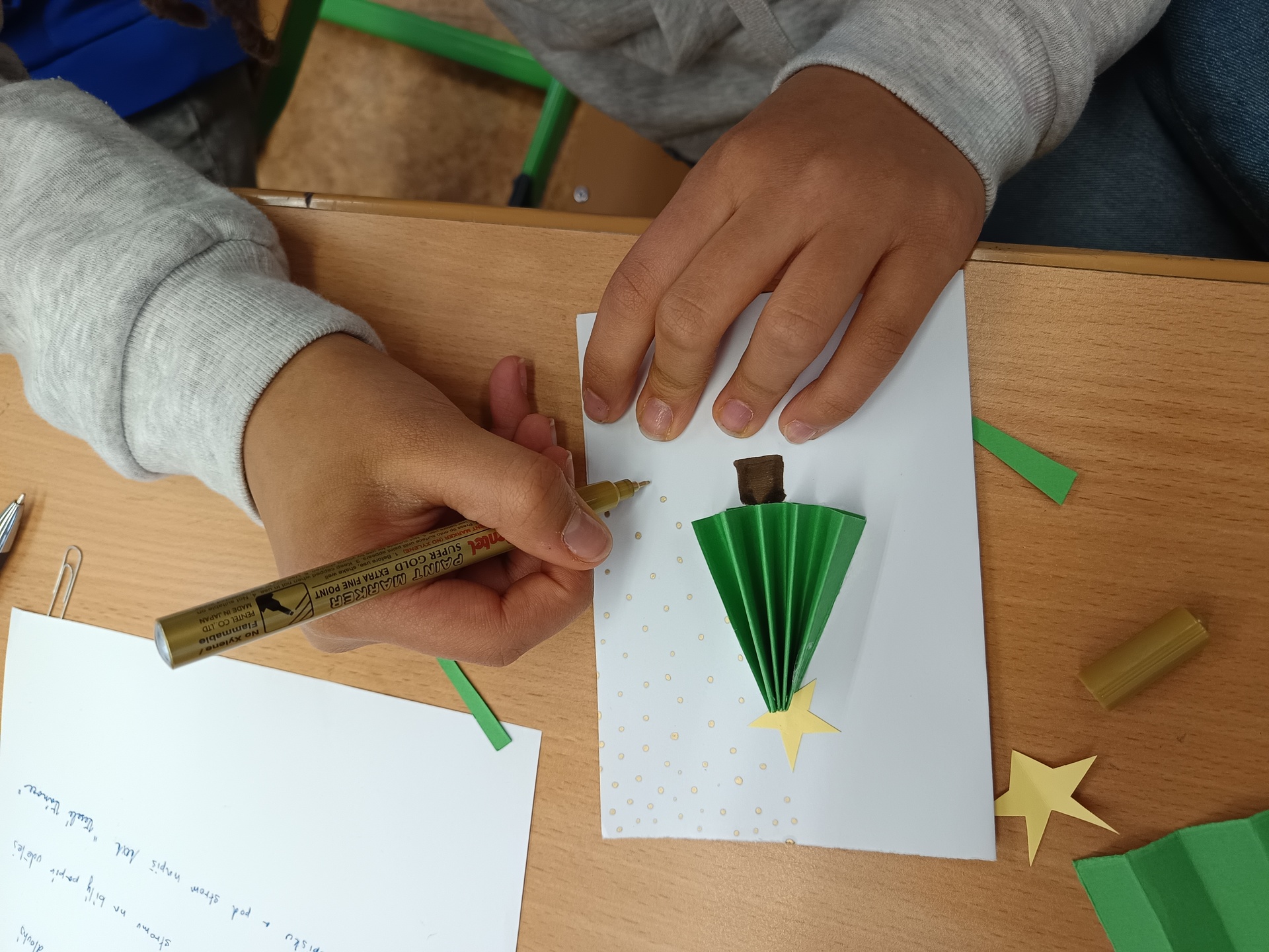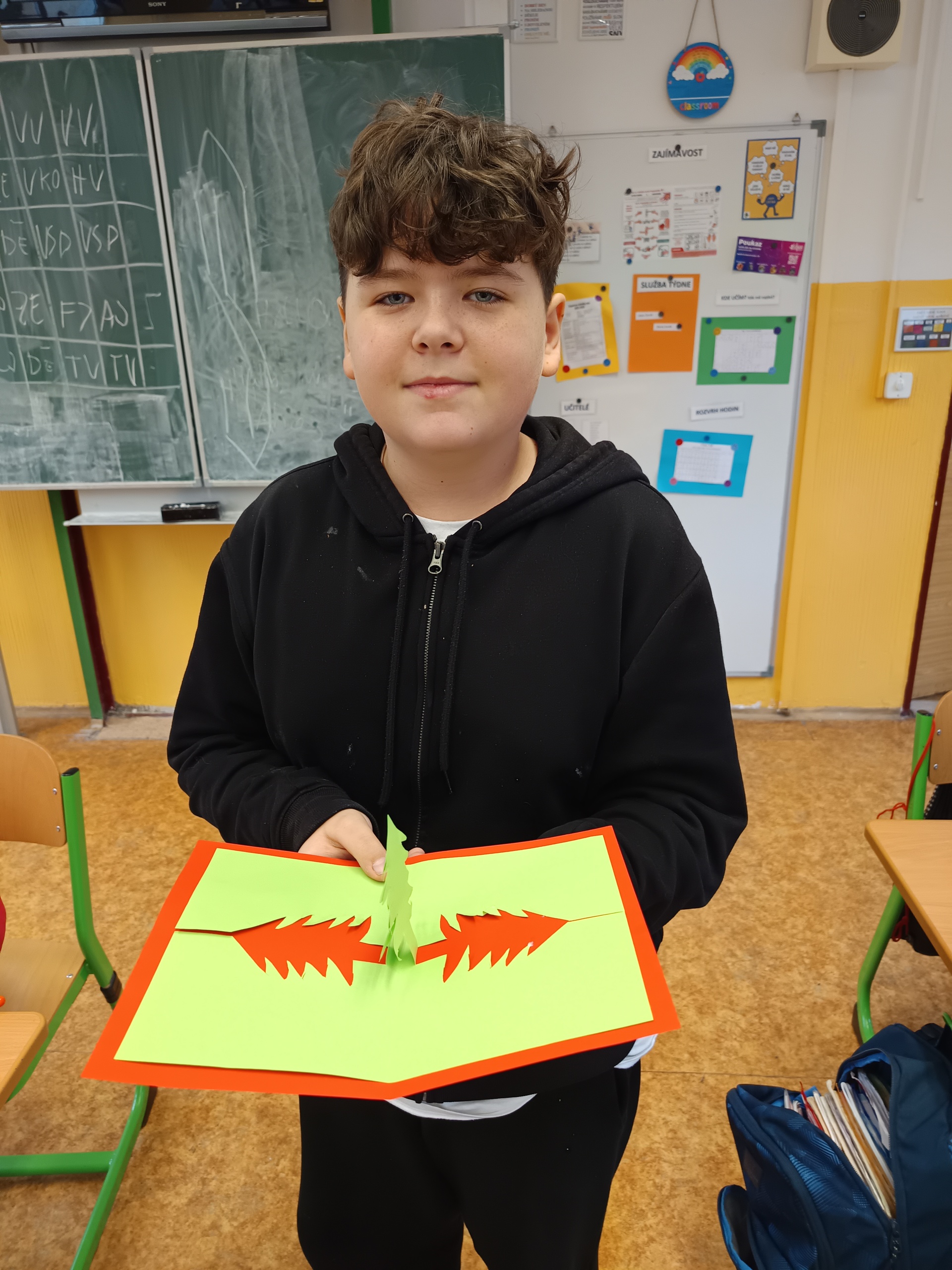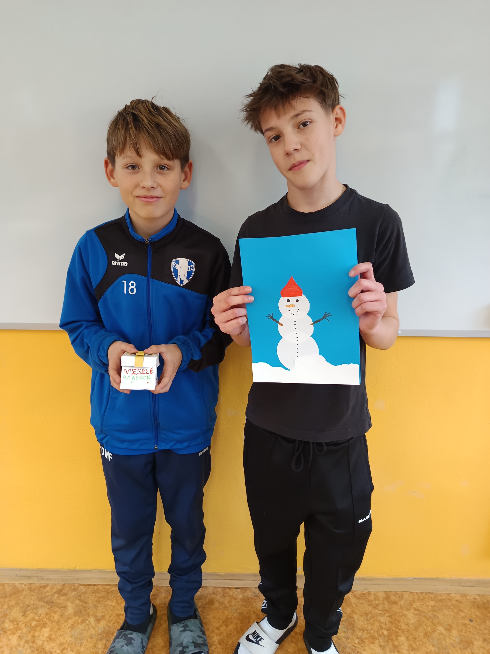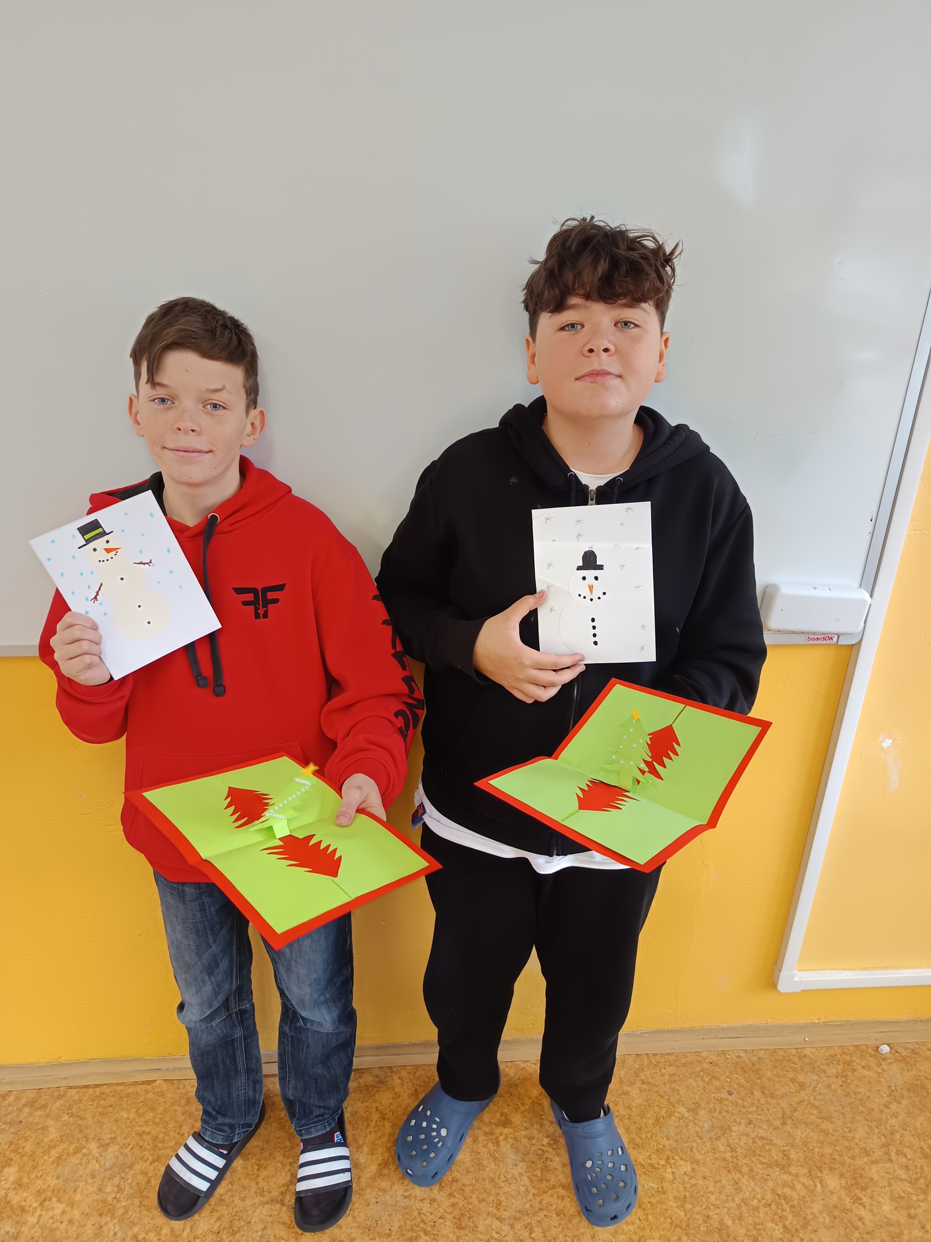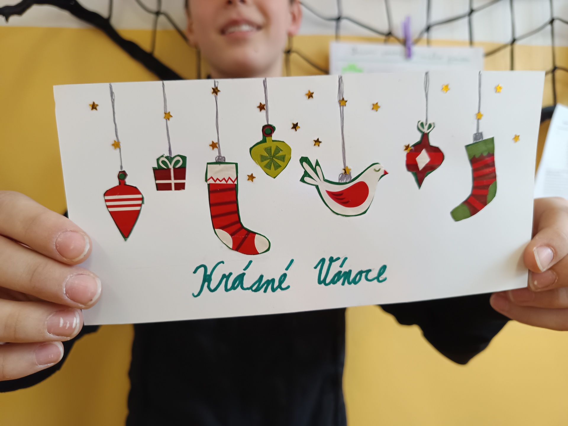 Na poslední hodinu slohu v roce 2025 každý žák svoji slohovou práci přinesl a k ní i všechny potřebné pomůcky a materiál. Třída byla rozlosována do dvojic, ve kterých pak žáci vyráběli přání dle písemných pokynů svého spolužáka. Na závěr hodiny si ve dvojicích sedmáci své výtvory ukázali, porovnali je s přáním vyrobeným doma a navzájem si dali zpětnou vazbu. Co v práci chybělo? Který krok nebyl srozumitelně vysvětlený? Proč si přání nejsou podobná? Bavilo je dílo, které si pro ně kamarád připravil? Co by v práci udělali lépe? Jaké změny navrhují? Díky celé aktivitě si žáci mohli sami mezi sebou nejlépe zhodnotit kvalitu svých slohových prací. A navíc jsme strávili vyučovací čas ve vánoční atmosféře.
