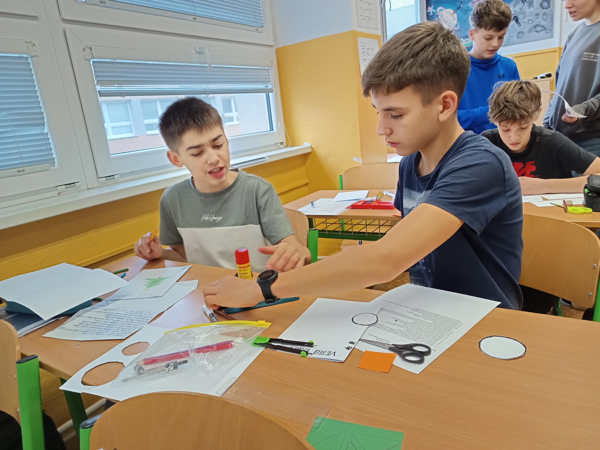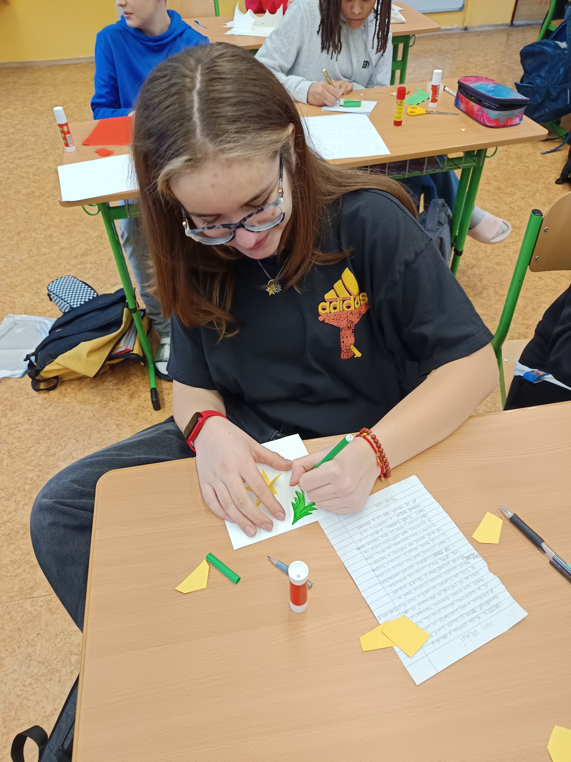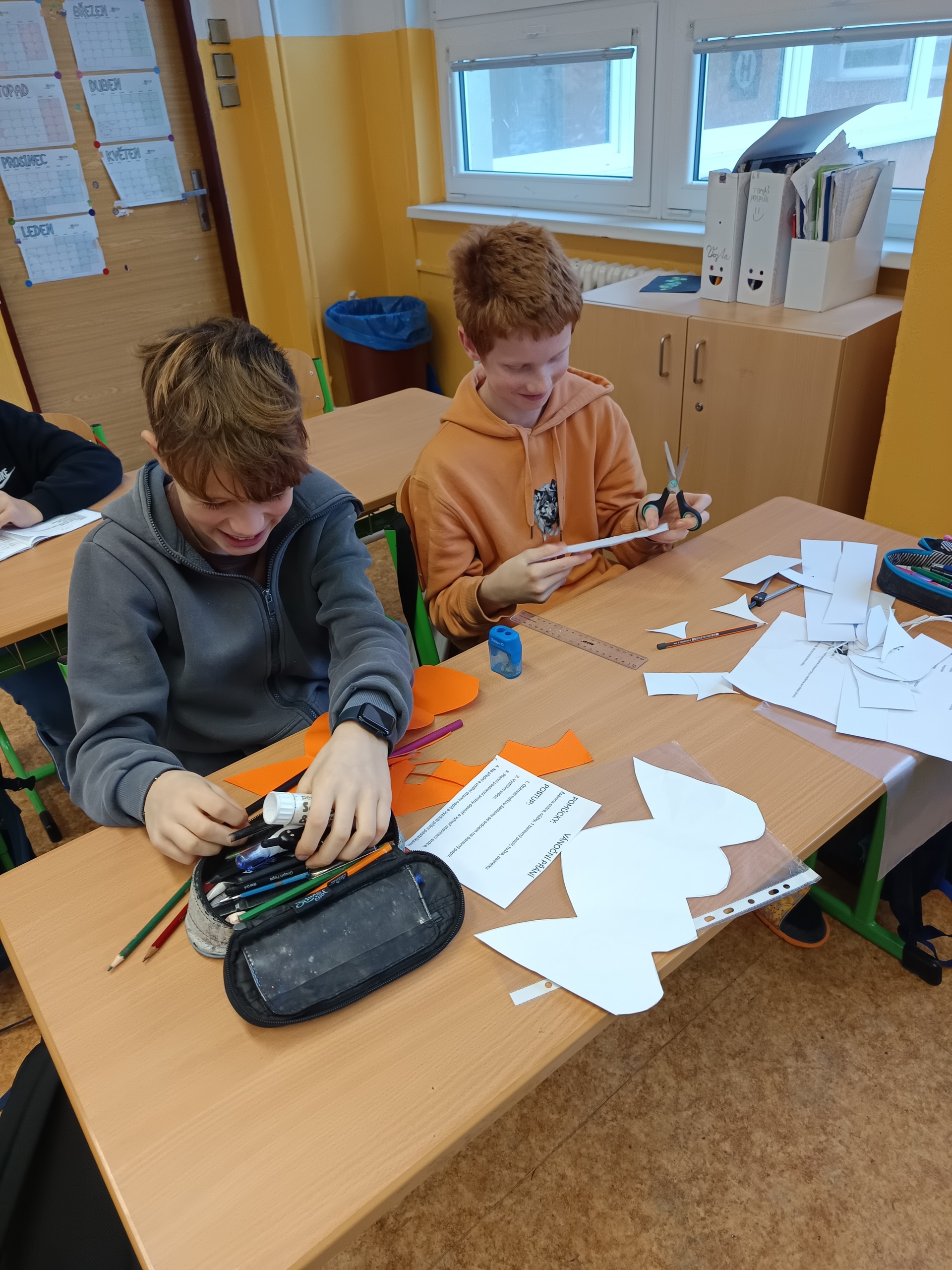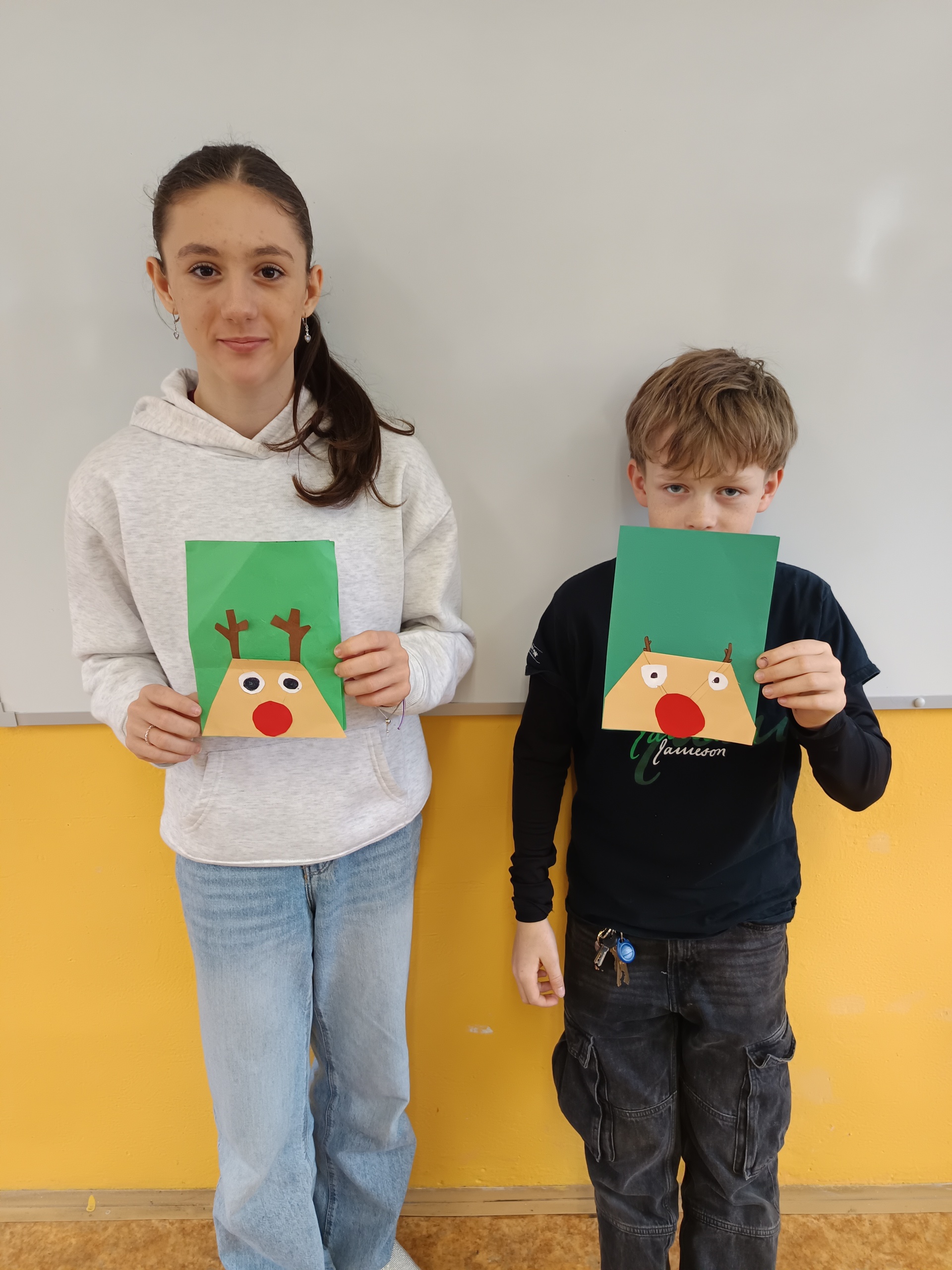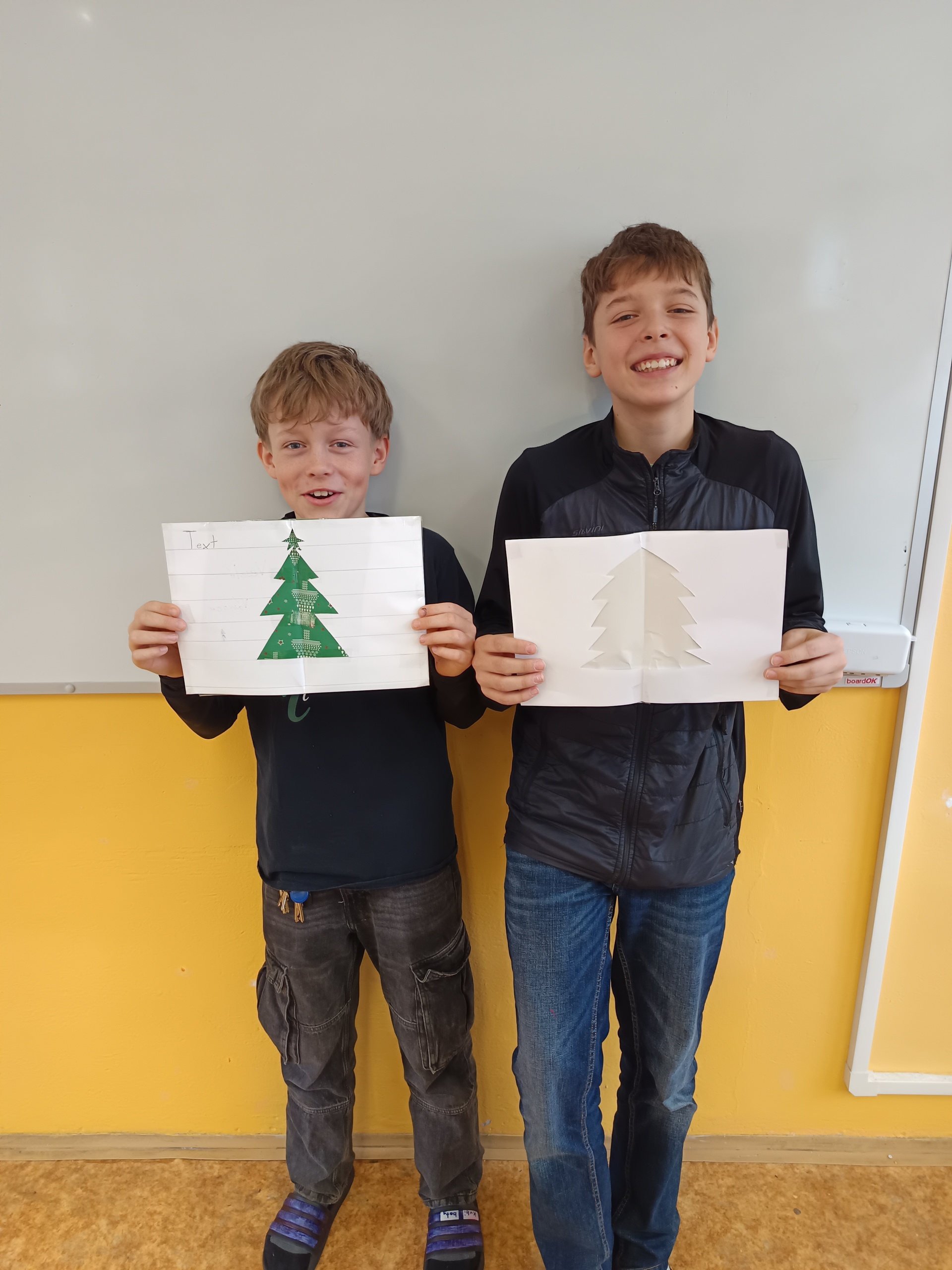 Na poslední hodinu slohu v roce 2025 každý žák svoji slohovou práci přinesl a k ní i všechny potřebné pomůcky a materiál. Třída byla rozlosována do dvojic, ve kterých pak žáci vyráběli přání dle písemných pokynů svého spolužáka. Na závěr hodiny si ve dvojicích sedmáci své výtvory ukázali, porovnali je s přáním vyrobeným doma a navzájem si dali zpětnou vazbu. Co v práci chybělo? Který krok nebyl srozumitelně vysvětlený? Proč si přání nejsou podobná? Bavilo je dílo, které si pro ně kamarád připravil? Co by v práci udělali lépe? Jaké změny navrhují? Díky celé aktivitě si žáci mohli sami mezi sebou nejlépe zhodnotit kvalitu svých slohových prací. A navíc jsme strávili vyučovací čas ve vánoční atmosféře.