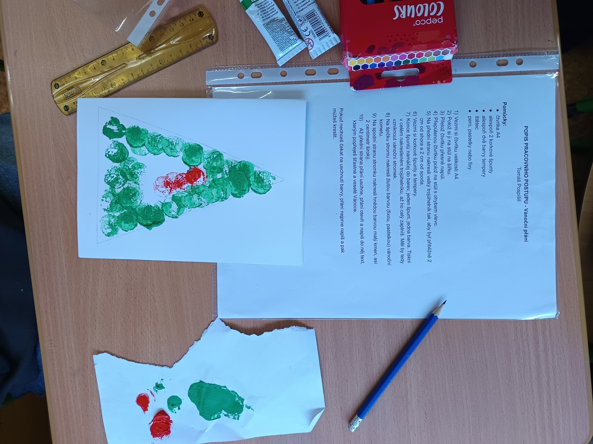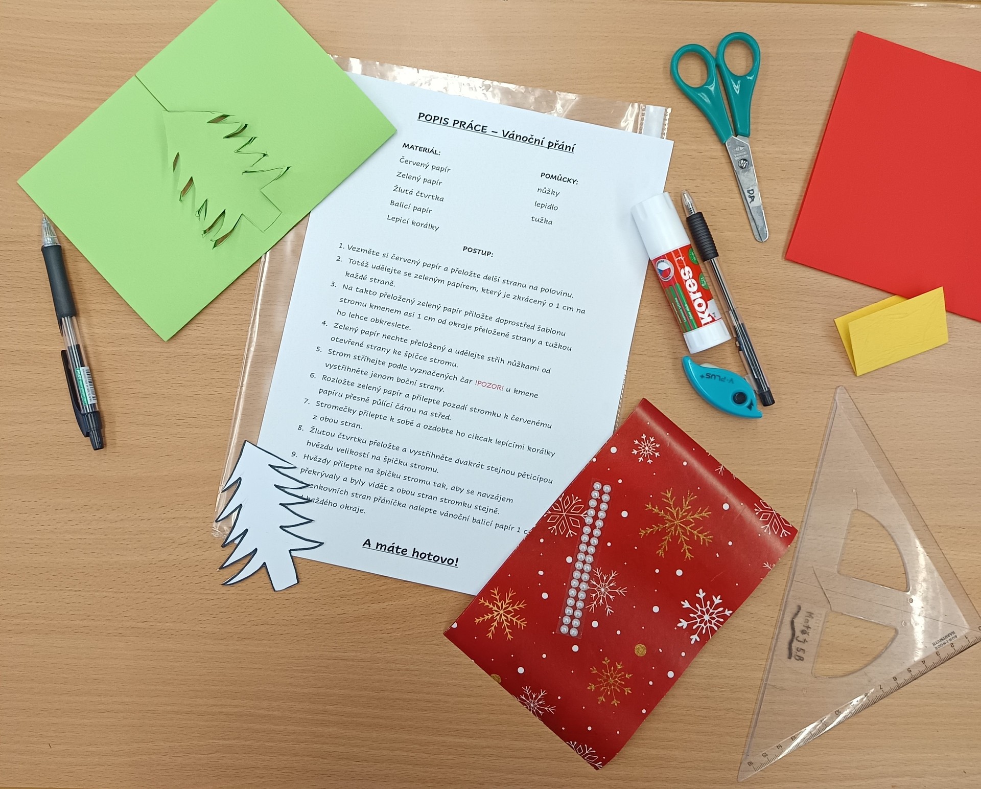 Další hodinu sedmáci pracovali s popisem pracovního postupu na výrobu vánočního přání. Seznámili se se všemi jeho náležitostmi. Pak si měli za úkol doma sami vyrobit přání dle vlastní fantazie či se nechat inspirovat internetovou nabídkou a následně sepsat co nejpodrobnější návod tak, aby podle něho dokázali spolužáci přání zhotovit.
