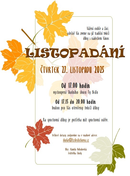 Zveme všechny rodiče a žáky na tradiční Listopadání plné her, dílniček a příjemné vánoční atmosféry. Letos se sejdeme 17. listopadu v 17:00 hodin. Rozpis jednotlivých dílniček najdete v textu článku.