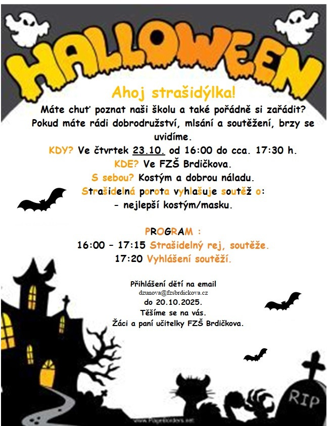 Vážení rodiče, dovolujeme si Vás a Vaše děti pozvat na návštěvu do naší školy. Dětem nabízíme hravý a zábavný program Halloween a rodičům možnost poznat naši školu společně se svými dětmi. V příloze přikládám plakát s dalšími informacemi a také s kontaktem pro přihlášení. Budeme moc rády, pokud naši nabídku přijmete a rodičům předškoláků informace předáte. Děkujeme. S pozdravem paní učitelky Dana Zunová, Monika Linhartová, Hanka Hlaváčková a děti z 5. tříd.