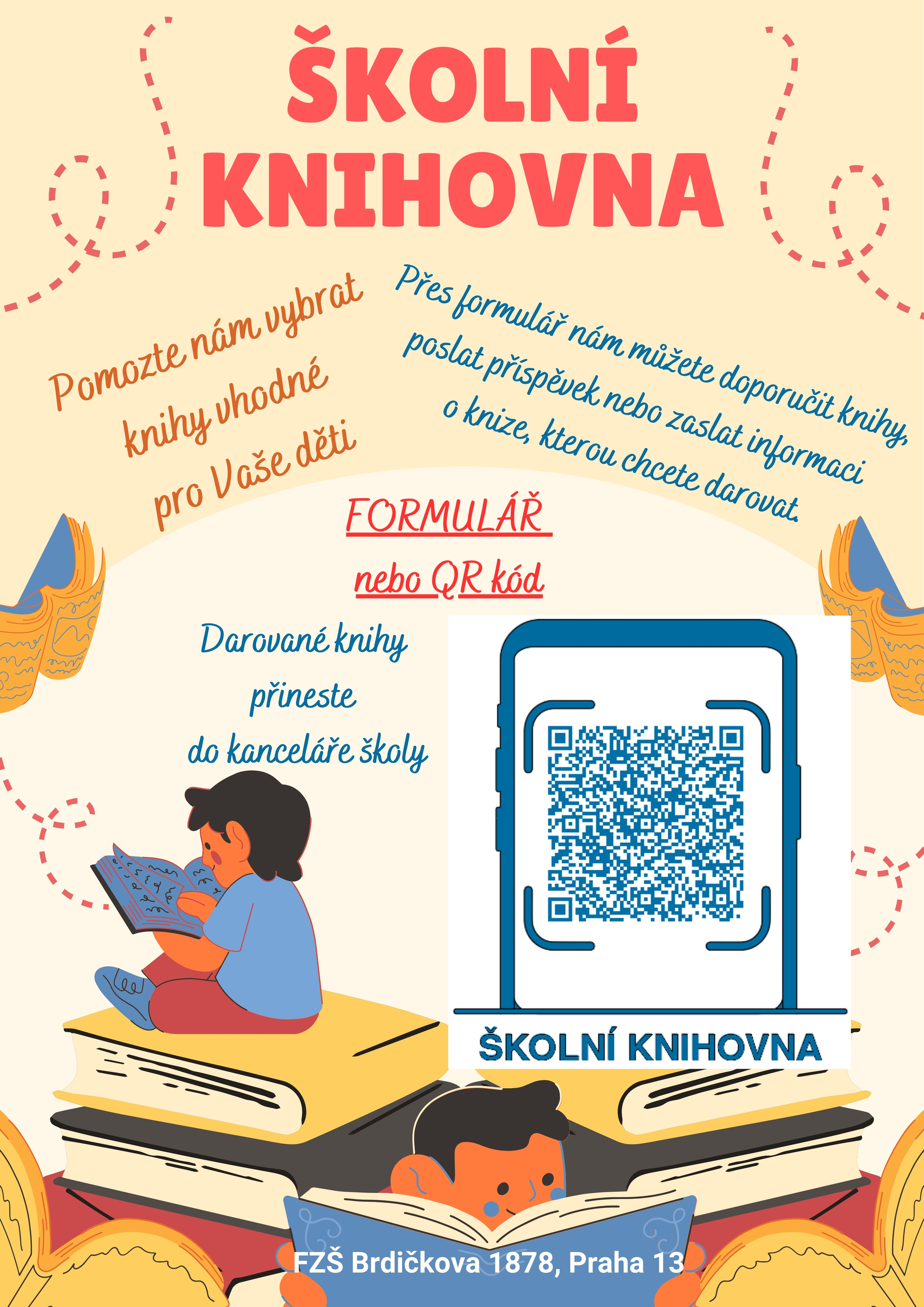 Vážení rodiče, žáci a přátelé školy, snažíme se o modernizaci naší školní knihovničky, protože chápeme, že dnešní generace žáků má úplně jiný čtenářský vkus a knihy, které jsou v naší původní knihovně, je nezaujmou. Proto jsme se rozhodli, že rozšíříme knihovnu o nové kousky a otevřeme následně knihovnu pro žáky i v dopoledních hodinách. Vás chceme požádat o spolupráci a to buď doporučením vhodné literatury, příspěvkem na nákup, nebo darování knih vhodných pro děti. Pokud Vás naše nabídka spolupráce oslovila, tak jsme připravili jednoduchý formulář, kde můžete napsat, o jakou formu spolupráce máte zájem. Děkujeme
