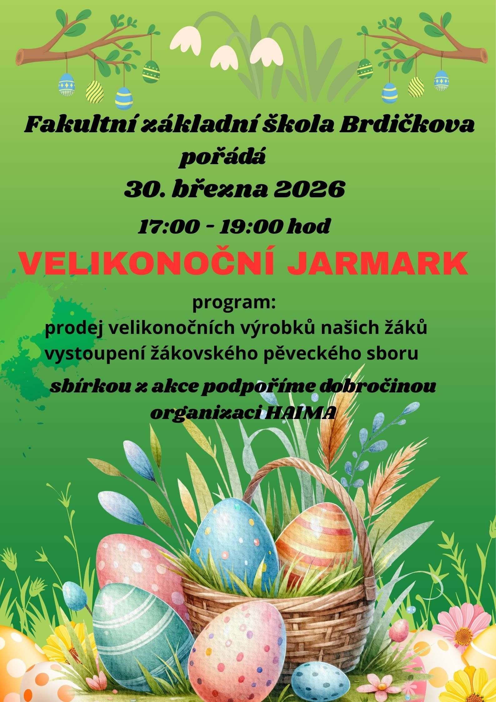 Vážení rodiče, žáci a přátelé naší školy, srdečně Vás zveme na Velikonoční jarmark, který se bude konat 30. 3. 2026 v 17 .00 hodin v prostorách naší školy. Těšíme se na Vás.