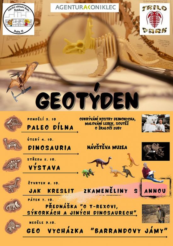 V rámci GEOTÝDNE se v úterý 4. 10. v dopoledních hodinách uskuteční pro žáky 6. - 9. tříd exkurze do DINOSAURIA MUSEUM PRAGUE. Akce je dobrovolná. Zájemci se mohou přihlásit ve sborovně paní učitelce Juřicové nebo Duškové vždy o velké přestávce ve dnech 30. 9. a 3. 10. a zároveň s sebou musí přinést 200 Kč na zaplacení zvýhodněného vstupného a žákovskou knížku na potvrzení o přijetí platby. Podrobnější informace žáci obdrží po uhrazení částky.
